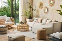 Introduceer natuurlijke materialen in jouw woonkamer en profiteer van hun veelzijdige, duurzame en uitstraling. Deze rotan fauteuil geeft veel boho-vibes aan jouw woonkamer, serre of balkon. De gebogen armleuningen zijn zeer decoratief, terwijl de dikke rotan poten voor stabiliteit zorgen. De zachte en comfortabele katoenen kussens hebben verwijderbare hoezen voor eenvoudig onderhoud. Bewaar het stuk binnenshuis tijdens het winterseizoen en verplaats het naar buiten als het weer opklaart.