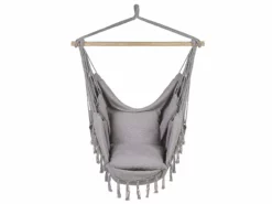 Mooi en functioneel, deze hangende hangmat zal een perfecte finishing touch zijn voor een veranda of een woonkamer. De zitting is gemaakt van sterke, hoogwaardige stof en versierd met smaakvolle kwastjes op de omtrek, met een Boheemse flair. Aan één kant zit een klein zakje, ideaal voor het opbergen van kleine accessoires. Samen met de meegeleverde kussens is het een heerlijke plek om onderuit te kruipen, een boek te lezen of gewoon te relaxen. De hangmat wordt volledig gemonteerd geleverd, verpakt in een stoffen tas en klaar om te worden gemonteerd.