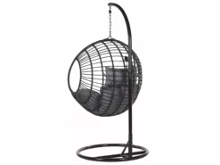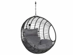 Ronde rotan hangstoel in stevig zwart metalen frame inclusief kussen.
