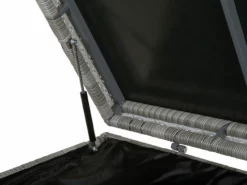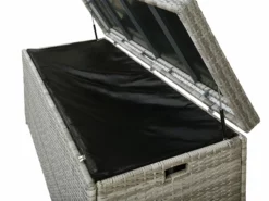 Deze kussenbox biedt veel opbergruimte en beschermt jouw kussens en dekens tegen water en zon. Dankzij de twee praktische handgrepen aan de zijkanten is de tuinkist gemakkelijk te vervoeren. Het rotandeksel kan gemakkelijk worden geopend en gesloten met twee gasveren. Een zwarte binnenschaal voorkomt het binnendringen van vuil en insecten. Het binnenste omhulsel uit één stuk is bevestigd met een sterke klittenbandsluiting en heeft dus optimale grip en kan indien nodig worden vervangen of gewassen. Houd er rekening mee dat bij zware en langdurige regenval de doos moet worden afgedekt.