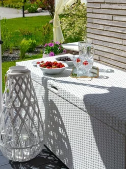 Deze kussenbox biedt veel opbergruimte en beschermt jouw kussens en dekens tegen water en zon. Dankzij de twee praktische handgrepen aan de zijkanten is de tuinkist gemakkelijk te vervoeren. Het rotandeksel kan gemakkelijk worden geopend en gesloten met twee gasveren. Een zwarte binnenschaal voorkomt het binnendringen van vuil en insecten. Het binnenste omhulsel uit één stuk is bevestigd met een sterke klittenbandsluiting en heeft dus optimale grip en kan indien nodig worden vervangen of gewassen. Houd er rekening mee dat bij zware en langdurige regenval de doos moet worden afgedekt.