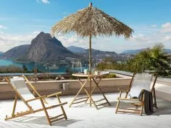 Deze set van twee ligstoelen is een geweldige aanvulling op elk balkon of terras. De ligstoelen van stevig bamboehout zijn UV-bestendig en hebben een gebroken wit polyester doek en een kussen. Het frame is opvouwbaar en kan gemakkelijk worden opgeborgen. De rugleuning kan in drie standen worden versteld. Het ligbed geeft je de perfecte plek om te ontspannen en je favoriete boek te lezen terwijl je geniet van de zon.