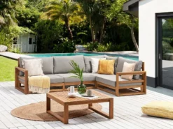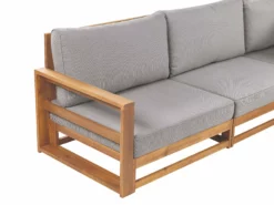 Deze klassieke tuinbankset wordt geleverd met een salontafel en 4 stoelen die kunnen worden gecombineerd tot een gezellige hoekbank of afzonderlijk kunnen worden gebruikt. Gemaakt van gecertificeerd acaciahout in een mooie, lichte houttint, perfect om buiten te loungen en gemakkelijk schoon te maken. Met de dik gevoerde zit- en rugleuningkussens in combinatie met een comfortabel, laag designframe is dit de perfecte blikvanger voor elke moderne tuin of terras.