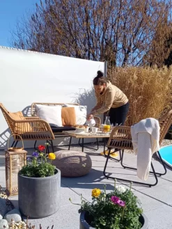 Licht waterafstotend waardoor je ze gemakkelijk buiten kan gebruiken, en buiten kan houden ondanks regen en vochtigheid. Wanneer het niet mogelijk is om binnen te zetten wanneer deze niet wordt gebruikt, raden we aan om een hoes te gebruiken. Het langdurig blootstellen van meubels en accessoires aan vocht kan schade veroorzaken.