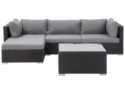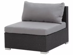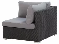De mooie wickerlounge bestaat uit een stoel, twee hoekstoelen en een hocker, waarop je je benen kunt strekken en je zo optimaal kunt ontspannen. Individuele combinatiemogelijkheden laten een perfecte aanpassing aan je gewenste opstelling toe. Aangename zitkussens overtuigen niet alleen door het hoogste comfort, maar verschaffen de tuinmeubelen ook een uniek uiterlijk. Een volwaardige theetafel met glazen plaat rondt deze combinatie harmonieus af. Dankzij het robuuste, zwarte polyrotan trotseert de groep elk weer en behoudt ze jarenlang haar charme. De poten van het rotan tuinmeubel zijn ook, door het verstellen van de hoogte, aan ongelijke oppervlakken aan te passen.