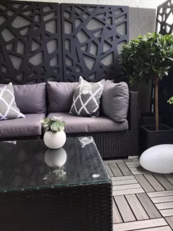 Licht waterafstotend waardoor je ze gemakkelijk buiten kan gebruiken, en buiten kan houden ondanks regen en vochtigheid. Wanneer het niet mogelijk is om binnen te zetten wanneer deze niet wordt gebruikt, raden we aan om een hoes te gebruiken. Het langdurig blootstellen van meubels en accessoires aan vocht kan schade veroorzaken.