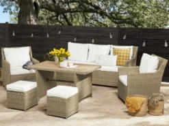 Licht waterafstotend waardoor je ze gemakkelijk buiten kan gebruiken, en buiten kan houden ondanks regen en vochtigheid. Wanneer het niet mogelijk is om binnen te zetten wanneer deze niet wordt gebruikt, raden we aan om een hoes te gebruiken. Het langdurig blootstellen van meubels en accessoires aan vocht kan schade veroorzaken.