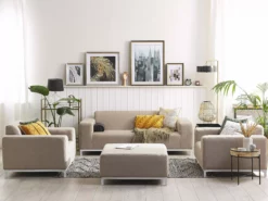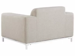 Dit loungeset bestaat uit een driezitsbank, 2 loungestoelen met armleuningen en een vierkante ottomaan. Het stabiele, witte onderstel is gemaakt van gepoedercoat metaal. Dit meubel is perfect om het hele jaar door te gebruiken, zowel binnen als buiten. De elegante, beige bekledingsstof is gemaakt van polyester. Deze tuinset is van binnen opgevuld met een sneldrogend schuim, dat dankzij zijn speciale structuur het water veel sneller laat doorstromen dan zeer elastisch schuim. Het gebruik van ademende materialen zorgt voor een uitstekende luchtcirculatie en bevordert een snelle droging, ook na zware regenval.