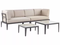 Creëer een comfortabele zithoek in je tuin met deze fantastische loungeset. Het frame is gemaakt van aluminium en daardoor verrassend licht en eenvoudig schoon te maken. Comfortabel zitten is gegarandeerd dankzij dik gevoerde zit- en rugkussens in een trendy kleur. De modulaire functie zorgt voor een snelle ontwerpverandering, het samenvoegen van de drie delen met een meegeleverde connector, of het creëren van aparte zitgroepen in een oogwenk. De set wordt ook geleverd met twee salontafels, wat hem buitengewoon multifunctioneel maakt.