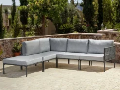 Dit elegante outdoor loungeset is gemaakt van robuust en weerbestendig aluminium in zwart, dat perfect wordt aangevuld met het grijs van de gestoffeerde kussens. De rechthoekige salontafel biedt niet alleen ruimte voor al je gasten maar hij is ook uitgerust met slimme techniek. Het tafelblad van veiligheidsglas kan aan drie zijden worden opgevouwen, zodat je je drankjes, snacks, mobiele telefoon of de computer gemakkelijk binnen handbereik hebt vanaf de bank. De hoekbankmodule bestaat uit verschillende delen die afzonderlijk of samen kunnen worden opgesteld.