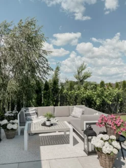 Deze tuinset is perfect voor mensen die graag buiten zitten. De set heeft een ruime hoekopstelling met een hoogwaardig houten frame en comfortabele kussens waarin je outdoor vele uren gaat genieten. Het frame van dit tuinmeubel is gemaakt van poedergecoat aluminium, waardoor je tuinset niet alleen licht is, maar ook bestand is tegen weersinvloeden en direct zonlicht.