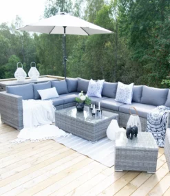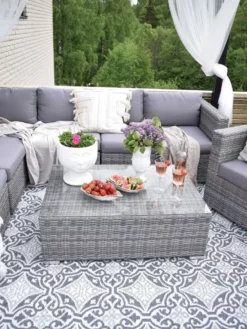 Maak het jezelf gemakkelijk in de heerlijk brede fauteuil met armleuningen of op de fantastische hoekcombinaties bestaande uit een driezitsbank met armleuningen, een tweezits hoekbank met armleuning en twee losse zitelementen zonder armleuningen. Of het nu wordt samengezet als een loungeruimte of individueel wordt opgezet, deze loungeset biedt vele flexibele opzet- en combinatiemogelijkheden. De salontafel en de praktische bijzettafel hebben beide een blad van transparant veiligheidsglas van 5 mm dik met afgeronde randen. Milieuvriendelijk tuinmeubilair van polyrotan is bijzonder populair dankzij de hoge kwaliteit, extreme weersbestendigheid en lange levensduur. Het materiaal is ontworpen voor langdurig buitenleven. Het frame van gepoedercoat aluminium garandeert maximale stabiliteit.