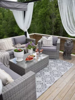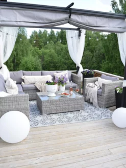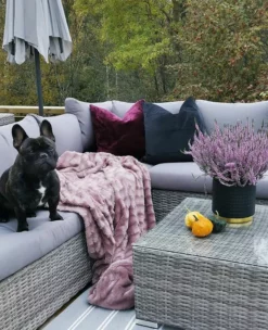 Licht waterafstotend waardoor je ze gemakkelijk buiten kan gebruiken, en buiten kan houden ondanks regen en vochtigheid. Wanneer het niet mogelijk is om binnen te zetten wanneer deze niet wordt gebruikt, raden we aan om een hoes te gebruiken. Het langdurig blootstellen van meubels en accessoires aan vocht kan schade veroorzaken.