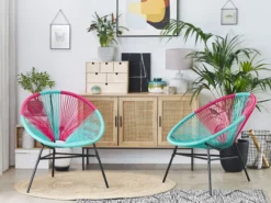 Deze vrolijke set bestaat uit 2 tuinstoelen. Deze meubels zijn uit een robuuste en bijzondere kunststof geweven, gecombineerd met een stabiele, zwarte frame. In het comfortabele en trendy spaghetti zitvlak kan je heerlijk de hete zomerdagen uithouden. Het opvallende design zorgt voor de juiste ventilatie. De stoel kan op alle binnen- en buitenplaatsen staan. Met deze stoel krijg je een heerlijke vakantie gevoel in je tuin of op je balkon.