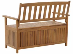 Deze ruime tuinbank van stevig acaciahout biedt je tegelijkertijd comfortabele zit- en opbergruimte. Zitkussens, tuingereedschap of andere zaken verdwijnen onder de lichtjes te openen zitting en liggen daar beschermd en mooi uit het zicht.