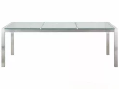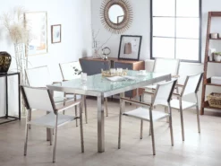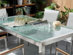 Een exclusieve tuinset die een stijlvolle touch geeft aan je tuin of terras. Met een mooie combinatie van roestvrij staal en glas voor een moderne uitstraling. Het tafelblad is weerbestendig en de lichte kleur past perfect bij de zilveren contouren. Het stalen frame is duurzaam, waardoor de meubelen ook na verloop van tijd mooi blijven. Stapelstoelen van stevig frame en UV-bestendig wit materiaal zijn een perfecte aanvulling op de tafel.