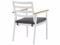 Praktisch en mooi om te zien – de hoogwaardige afwerking van gepoedercoat aluminium in wit wordt vakkundig aangevuld met armleuningen in een warme houtlook. Door deze kleur- en materiaalcombinatie ademt de set een moderne en zeer gezellige sfeer uit. Dankzij de extra grijze zitkussens staat niets langere maaltijden en een gezellige samenkomsten in de weg.