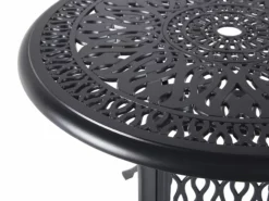 Geniet optimaal van de warme en zonnige zomerdagen dankzij deze eethoek voor buiten. Het tuinset is gemaakt van lichtgewicht en toch robuust aluminium, biedt het een comfortabele eetervaring voor een gezelschap van vier. Zowel de stoelen als de tafel hebben gewelfde vormen en patronen die een elegante, vintage touch toevoegen aan elke omgeving. De set wordt geleverd met vier, royaal gevoerde zitkussens voor optimaal comfort.