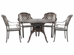 Deze set met retro-look, donkerbruine kleur en afneembaar tafelblad maken van deze tuinset een must-have in elke buitenruimte. Dankzij de vier stoelen en de ronde tafel van hoogwaardig aluminium is de set geschikt voor ontbijt en brunch, maar ook voor een kopje koffie.