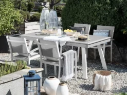 Het stevige, witte frame van de stoelen is gemaakt van roestbestendig aluminium en een bekleding van robuust, grijs textiel. Het triplexoppervlak op de armleuningen is niet alleen een elegante touch, maar beschermt ook je huid tegen het koude metaal, waardoor je nog comfortabeler zit. Combineer de set met een tafel en creëer een uitnodigende eethoek zodat je in de zomer kunt grillen of ’s ochtends kunt ontbijten in de tuin.