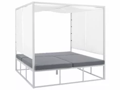 Bereid je voor op de ultieme rust in de frisse lucht. Dit outdoor ligbed heeft een stoffen luifel, die langs de palen naar beneden hangt en een schaduw werpt op de ligstoelen eronder. Dit hemelbed is een perfecte plek voor een zomerrust in de tuin of bij een zwembad. De rugleuningen zijn verstelbaar zodat je altijd optimaal kan genieten van het weer. De verstelbare witte kap verspreidt het zonlicht, waardoor het altijd aangenaam is. Bovendien is het stevige aluminium frame bestand tegen water en roest, en vormt het een perfecte combinatie met de UV- en waterbestendige polyester kap en kussenhoezen.